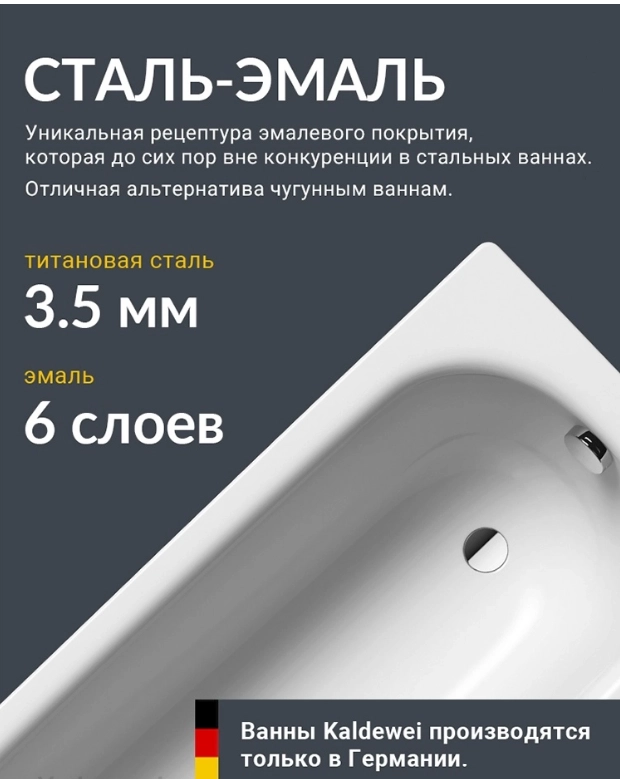 Антискользящее покрытие: Нет Сталь-эмаль KALDEWEI намного прочнее акрила и очень устойчива к механическому воздействию.