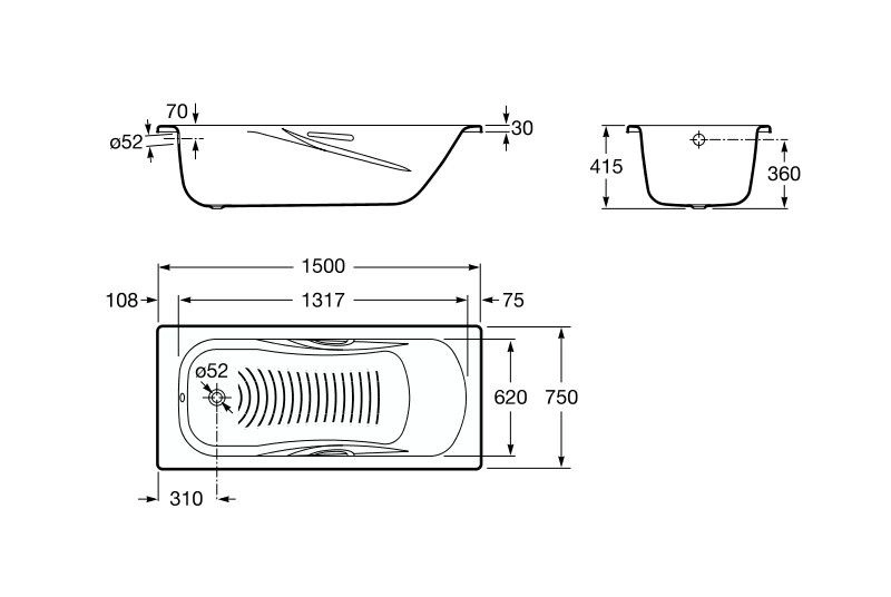 Эмалированная ванна из штампованной стали со встроенными подлокотниками, хромированными металлическими ручками( приобретаются отдельно), противоскользящим покрытием дна и звукоизоляцией. Слив-перелив заказывается отдельно.