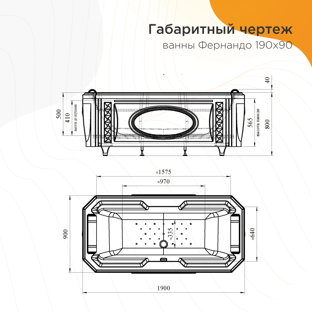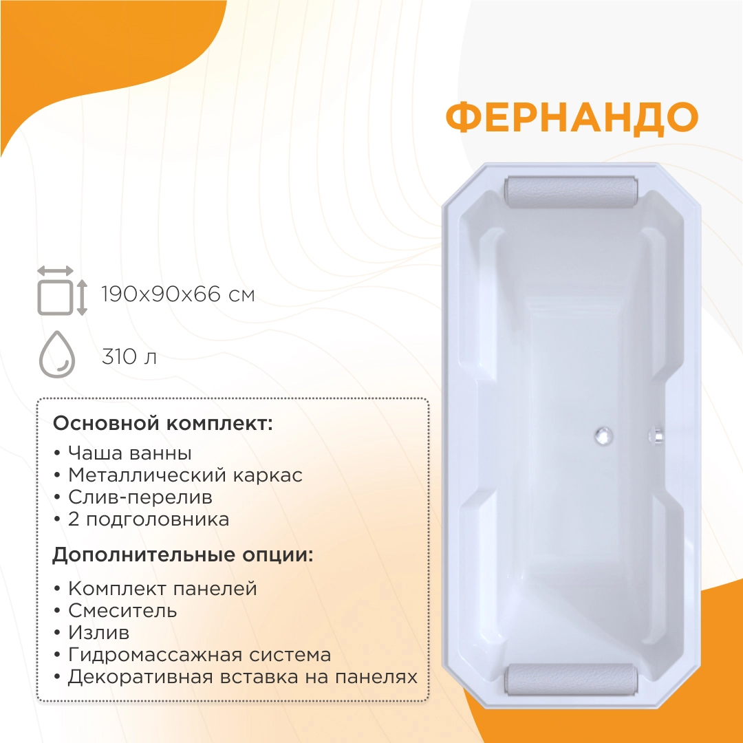 Акриловая ванна "Фернандо" 190х90 см обладает прямоугольной формой с изящными боковыми выступами, благодаря чему выглядит элегантно и современно. Эта модель станет идеальным выбором для ванной комнаты в классическом стиле — она сочетает в себе шик, красоту и функциональность. Ванна удобна в использовании и представлена в двух вариантах монтажа: отдельностоящий, с комплектом декоративных панелей, и