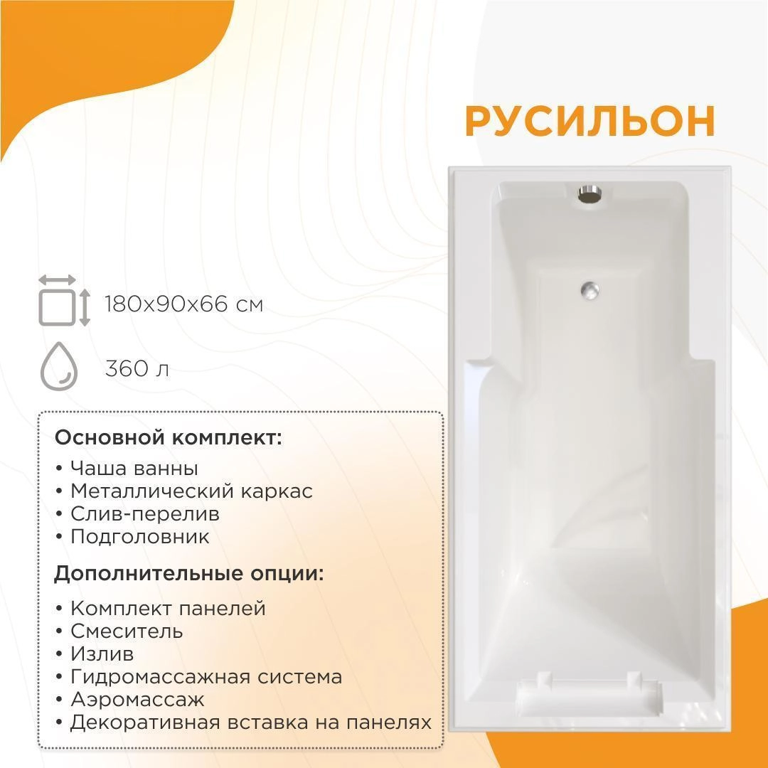 Акриловая ванна "Русильон" 180х90 — роскошная прямоугольная ванна ручной работы с винтажным стилем. Возможна установка отдельно или встраиванием в пол/подиум. Отдельностоящий вариант включает панели и отделку кристаллами Swarovski, мозаикой и эмблемами.