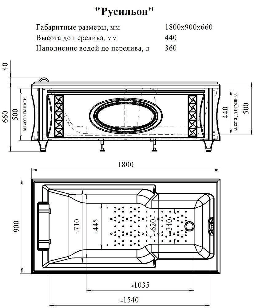 Акриловая ванна "Русильон" 180х90 — роскошная прямоугольная ванна ручной работы с винтажным стилем. Возможна установка отдельно или встраиванием в пол/подиум. Отдельностоящий вариант включает панели и отделку кристаллами Swarovski, мозаикой и эмблемами.