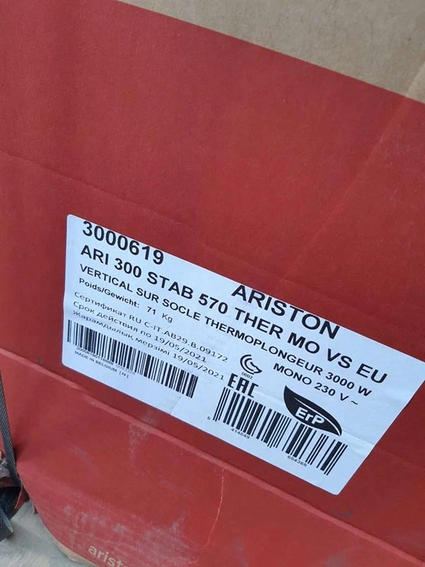Водонагреватель накопительный Ariston ARI 300 STAB 570 THER MO VS EU 3000619- Водонагреватель - Тип - Накопительный - Способ нагрева - Электрический - Способ монтажа - Напольный - Способ установки - Вертикальный - Форма корпуса - Цилиндрический стандартный - Материал корпуса - Металл - Цвет корпуса - Белый - Управление - Механическое - Материал внутреннего бака - Сталь - Покрытие внутреннего бака - Titanium+ - Количество внутренних баков шт 1 - Количество нагревательных элементов шт 1 - Тип нагревательного элемента - Трубчатый - Подключение холодной воды - Сбоку - Подключение горячей воды - Сверху - Объем л 300 - Мощность Вт 3000 - Количество режимов нагрева - 1 - Время нагрева всего объема (ΔT=45°С) - 5 ч 36 мин - Тепловые потери при T=60°С кВт∙ч за 24 ч 2,85 - Максимальная температура нагрева воды °С 75 - Минимальное давление воды бар 0,2 - Максимальное давление воды бар 6 - Напряжение В 230 - Комфорт и безопасность - Внешний регулятор температуры - Нет - Функция "Активная электрическая защита" - Нет - Функция "Защита при включении без воды" - Нет - Функция "ECO EVO" - Нет - Функция “Ускоренный нагрев” - Нет - Функция "Быстрый нагрев" - Нет - Электропитание - Без кабеля питания - Класс защиты IP IP25D - Вход холодной воды " 3/4 - Выход горячей воды " 3/4 - Линия рециркуляции " Нет - Высота - 1800 мм - Ширина - 570 мм - Глубина - 635 мм - Вес - 71 кг