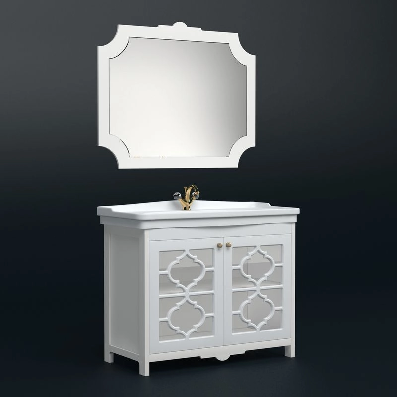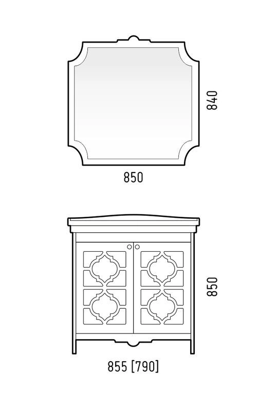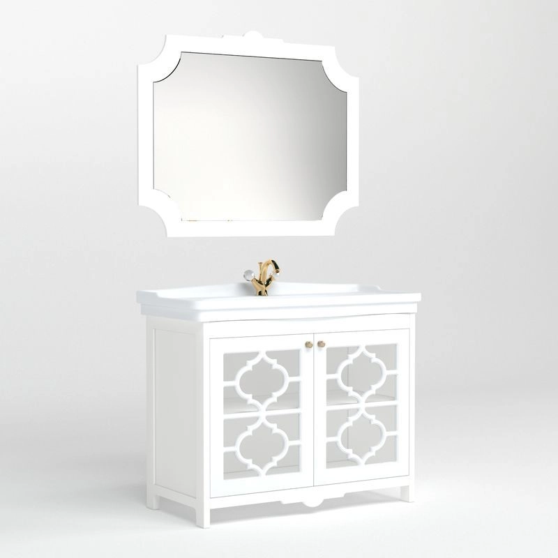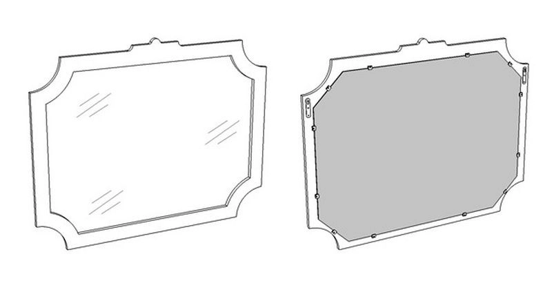 Комплексное решение для роскошных ванных комнат. Зеркало представляет собой фрезерованный задник и зеркало. На зеркало сзади наклеена противоосколочная плёнка. Зеркало вешается на стену при помощи мебельных подвесов. Задник МДФ покрашен в белую матовую эмаль.