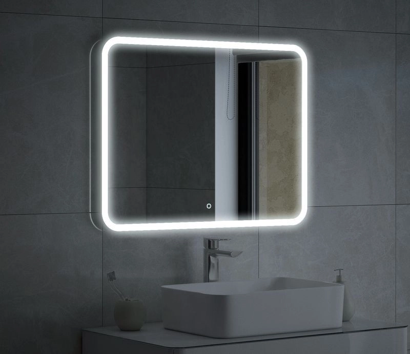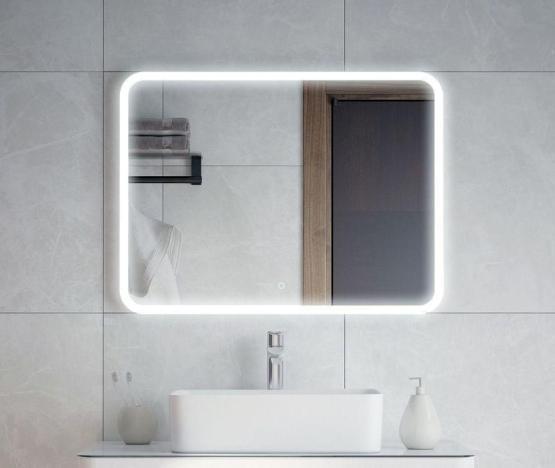 Зеркало оснащено LED-подсветкой и сенсорным выключателем с регулировкой яркости. Ширина 800, высота 600 мм. Углы скруглены. По всему периметру идёт область пескоструя шириной 25 мм. Подсветка этой области осуществляется при помощи нажатия кнопки. Существует возможность регулировки освещенности (делать подсветку ярче или темнее). Класс защиты: IP67. Класс энергетической эффективности: A++. Серебряное зеркало, стекло высшего качества M1. AC/DC трансформатор.