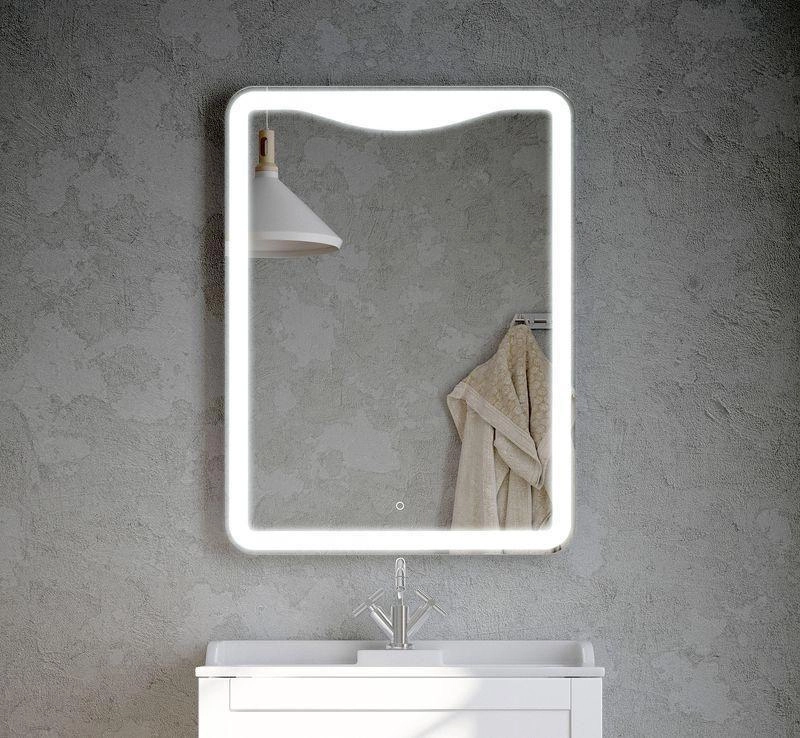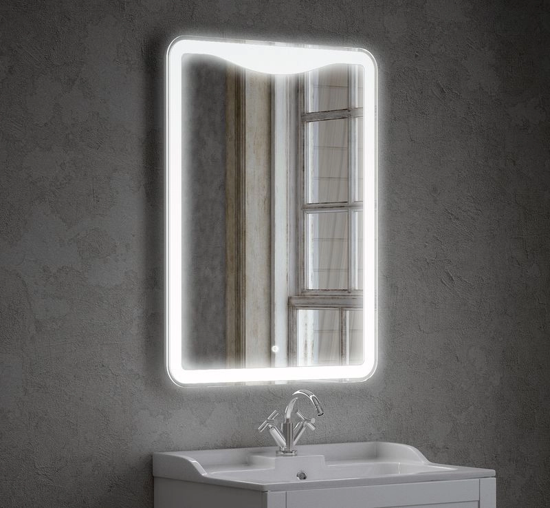 Зеркало Орли шириной 600 мм, высотой 800 мм. С отступом в 10 мм от края по всему периметру зеркала идёт область пескоструя шириной в 30 мм. Углы скруглены. Сверху зеркала - пескоструй в форме чёлочки. Подсветка этой области осуществляется при помощи нажатия кнопки. Существует возможность регулировки освещенности (делать подсветку ярче или темнее). LED-подсветка, сенсорный выключатель с регулировкой яркости. Класс защиты: IP67. Класс энергетической эффективности: A++. Серебряное зеркало, стекло высшего качества M1. AC/DC трансформатор.