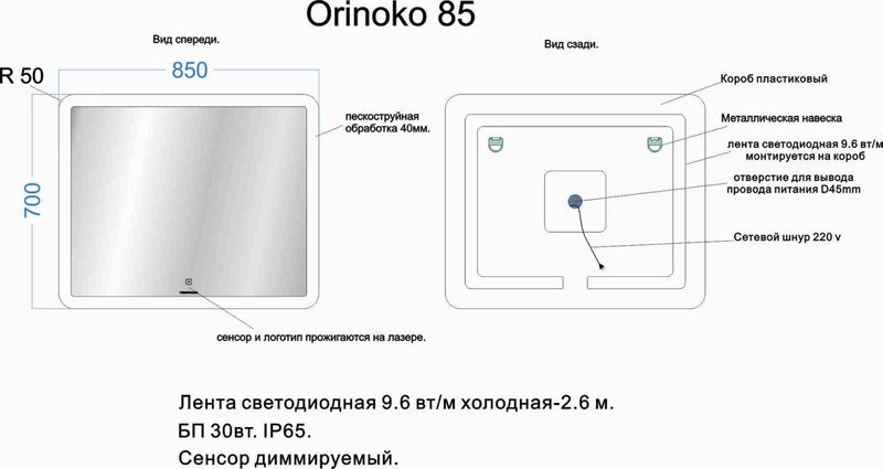 Материал корпуса акрил. Материал фасада зеркало. В комплекте: крепления. Мощность подсветки 12Вт