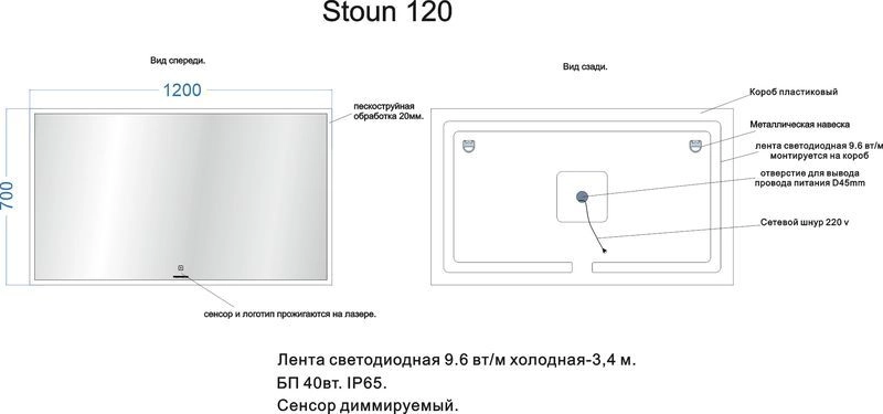 Материал корпуса акрил. Материал фасада зеркало. В комплекте: крепления. Мощность подсветки 12Вт