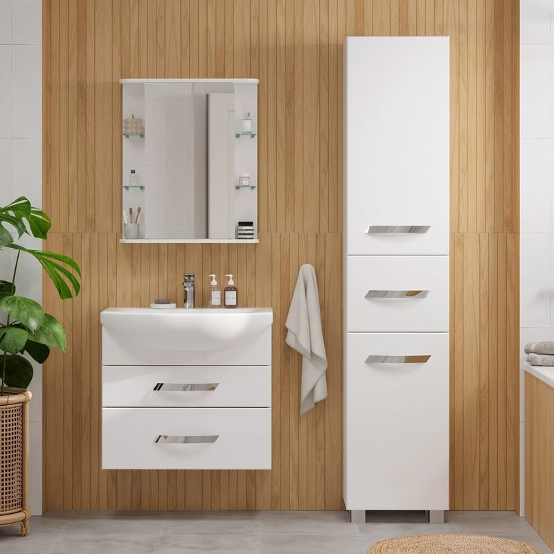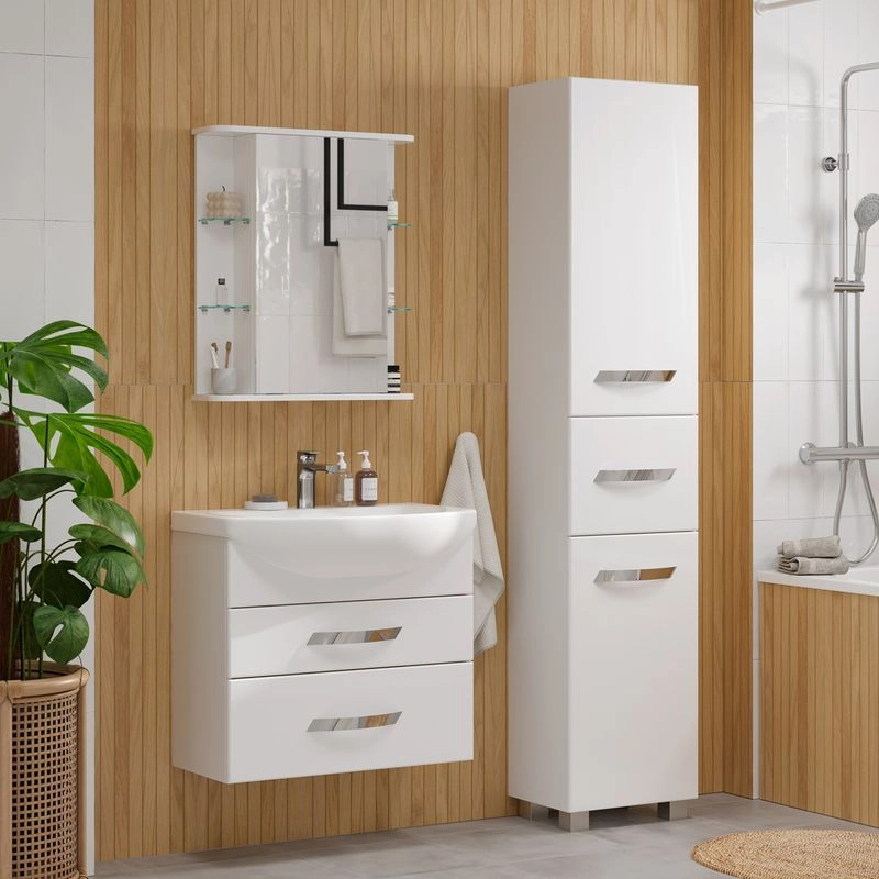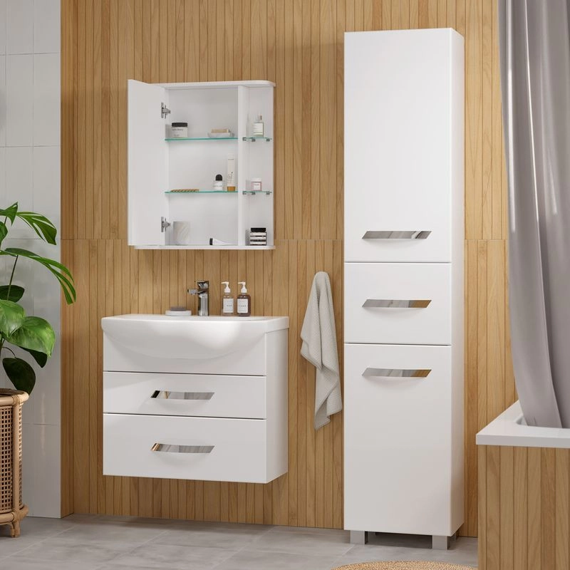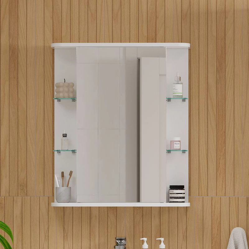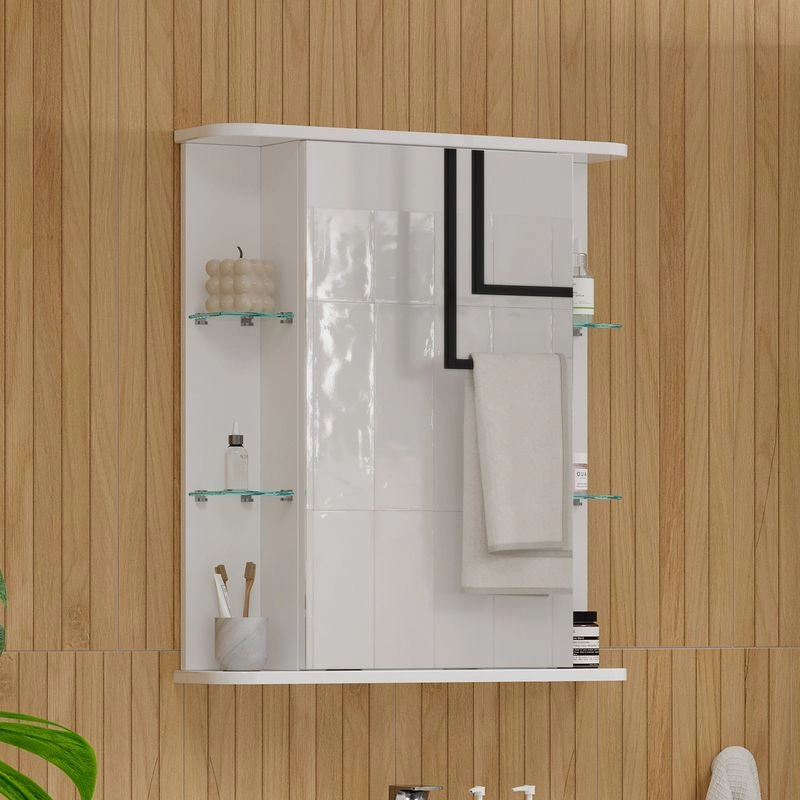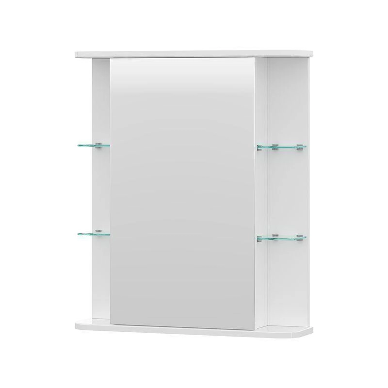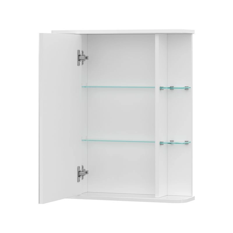 Шкаф зеркальный с 2 двумя внутренними стеклянными полками и 4-мя внешними. По умолчанию шкаф зеркальный собран с открыванием дверки налево. При необходимости дверку можно перевесить на открывание направо. Петли на дверце с доводчиками.
