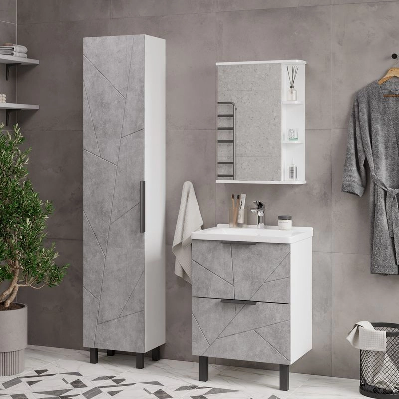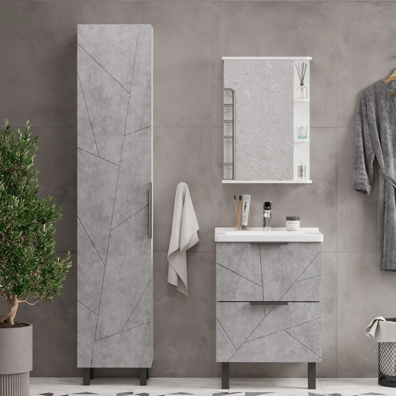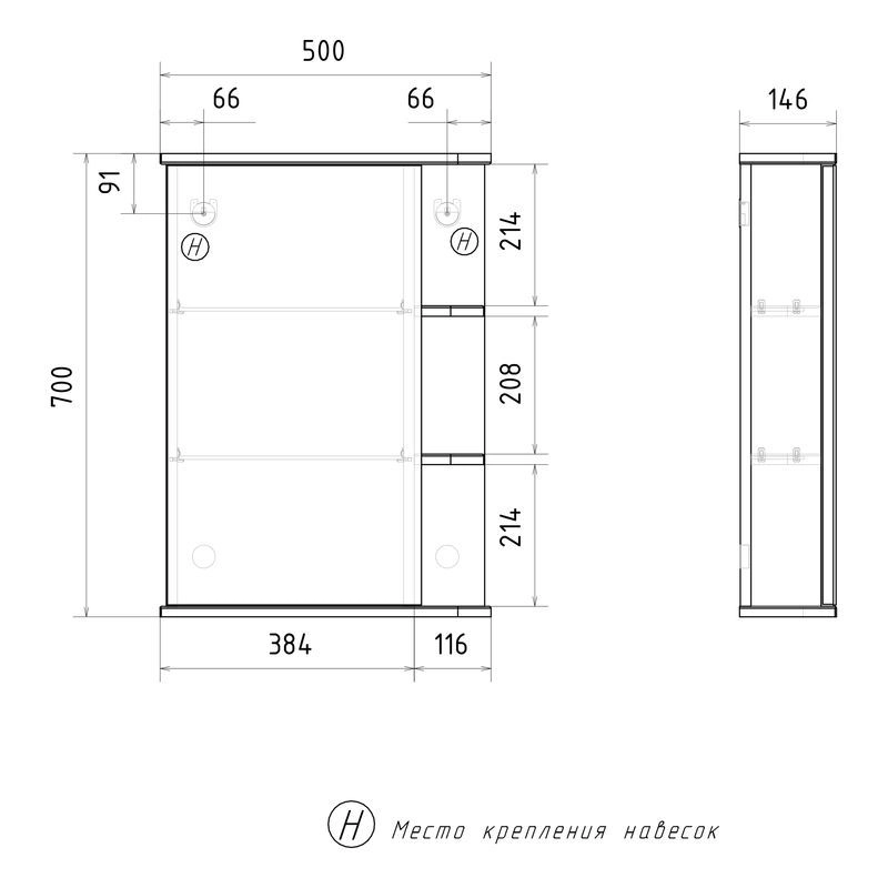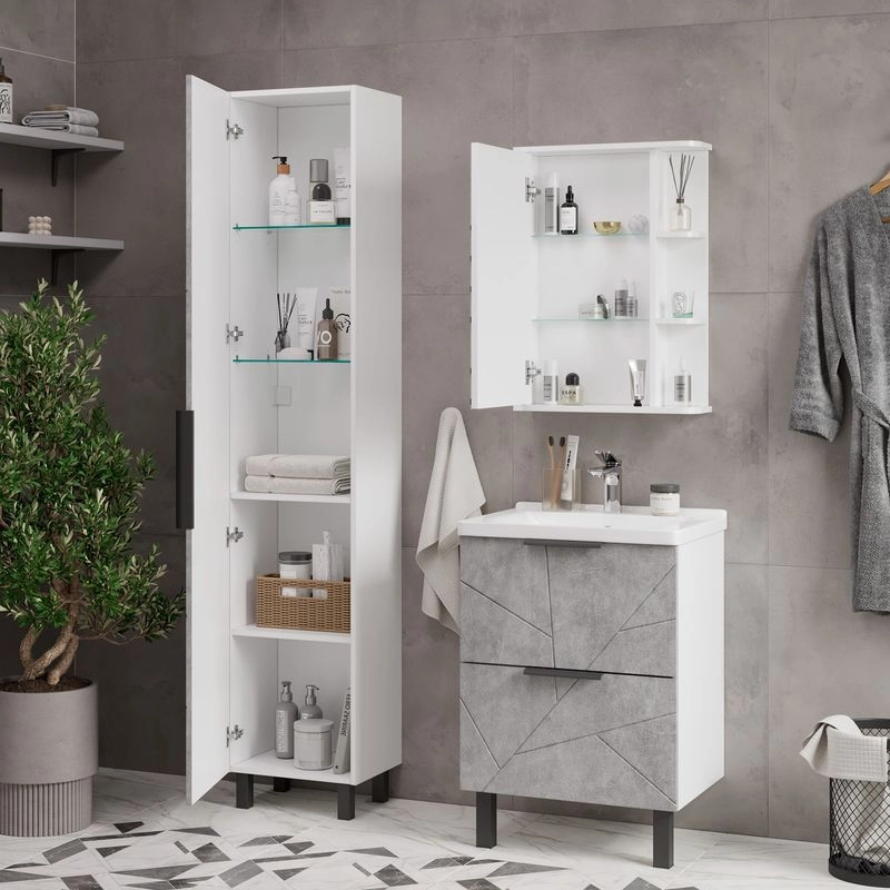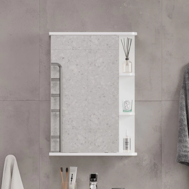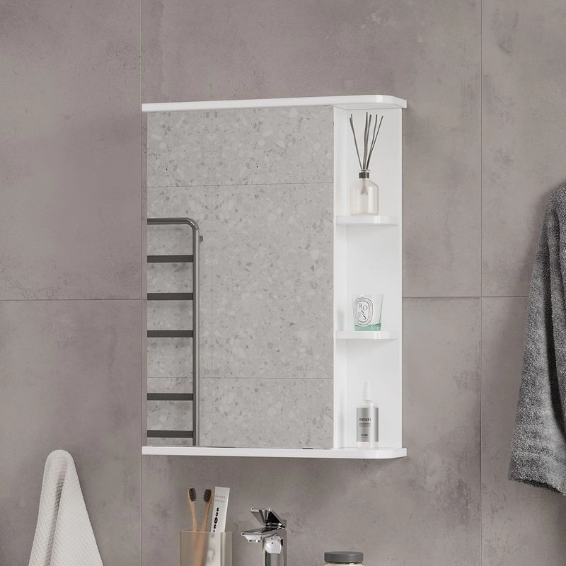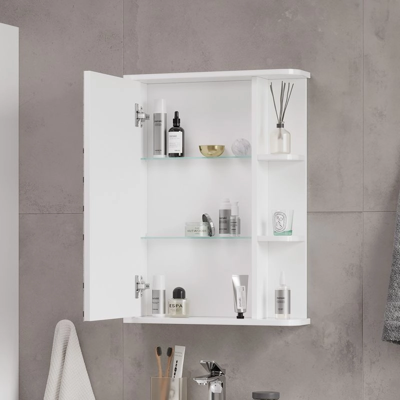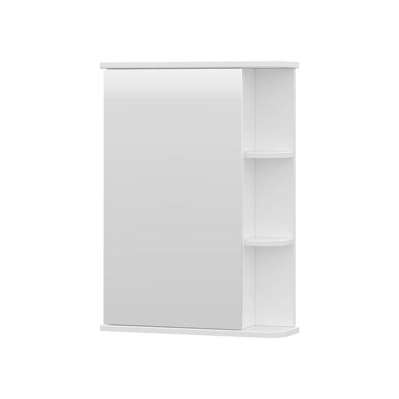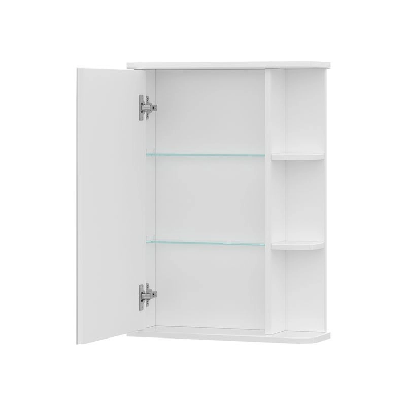 Шкаф зеркальный с 2-мя внутренними стеклянными полками и 2-мя внешними полками из МДФ. По умолчанию шкаф зеркальный собран с открыванием дверки налево. При необходимости дверку можно перевесить на открывание направо. Петли на дверце с доводчиками.