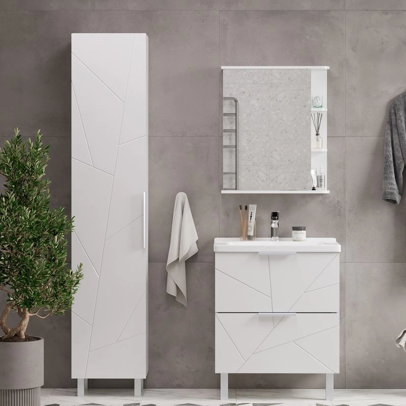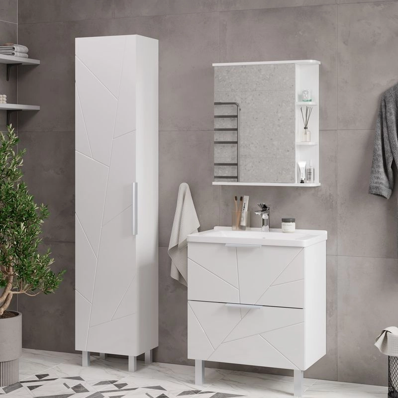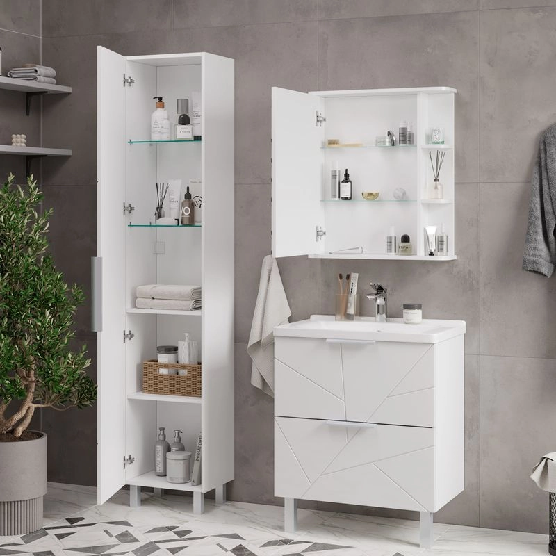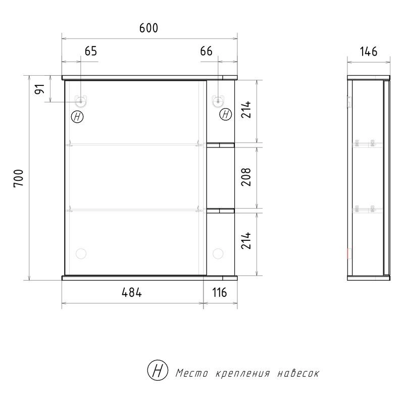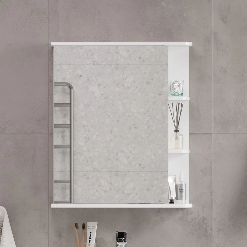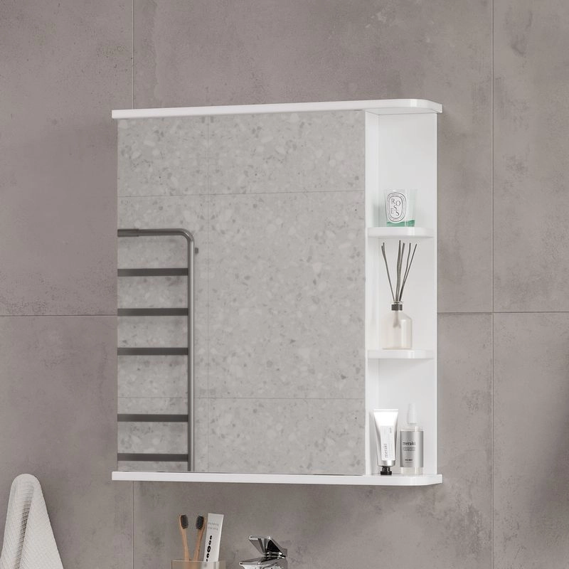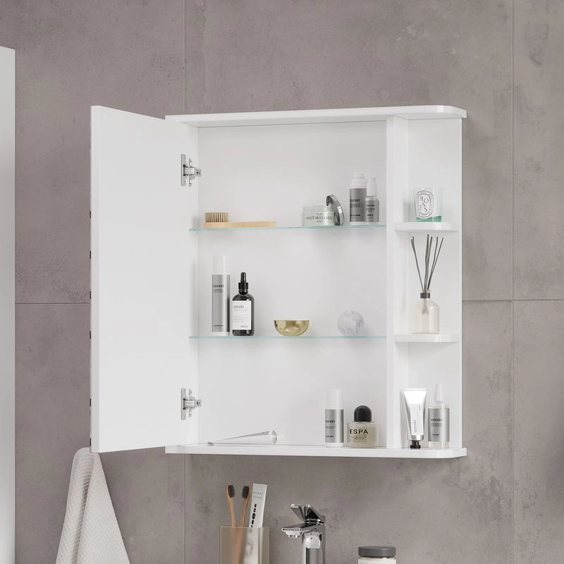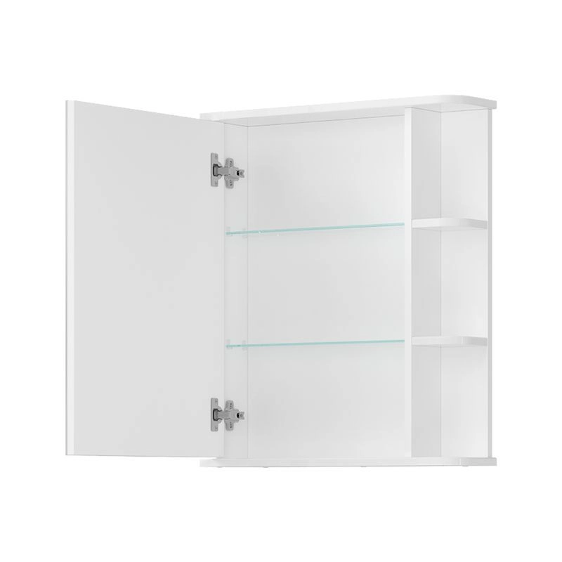 Шкаф зеркальный с 2-мя внутренними стеклянными полками и 2-мя внешними полками из МДФ. По умолчанию шкаф зеркальный собран с открыванием дверки налево. При необходимости дверку можно перевесить на открывание направо. Петли на дверце с доводчиками.