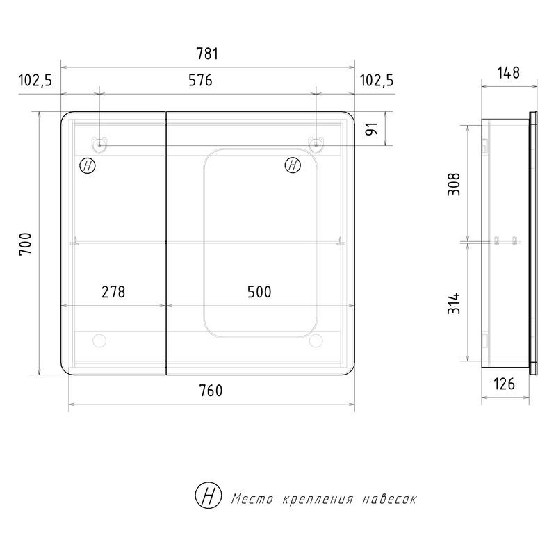 Шкаф зеркальный с двумя дверками разной ширины и с одной внутренней стеклянной полкой. При необходимости дверки можно поменять местами. Петли на дверцах с доводчиками.