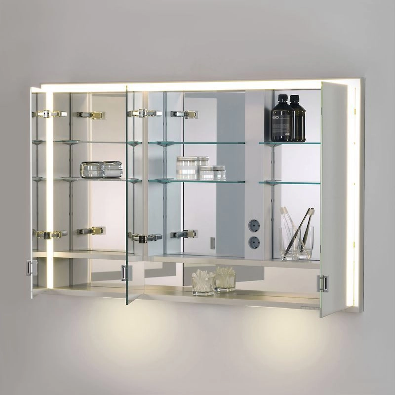 Для монтажа на стене бесступенчатая настройка тона подсветки от 2700 Кельвин (теплая белая) до 6500 Кельвин (дневной свет), 3 поворотные дверцы с двусторонним озеркаливанием стекла, корпус из анодированного серебристого алюминия, боковины корпуса из белого лакированного стекла, задняя стенка зеркальная