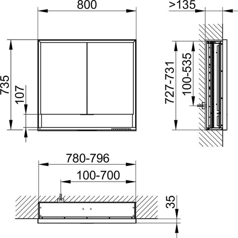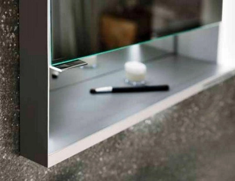 Для встраиваемого монтажа, бесступенчатая настройка тона подсветки от 2700 Кельвин (теплая белая) до 6500 Кельвин (дневной свет), 2 поворотные дверцы с двусторонним озеркаливанием стекла, корпус из анодированного серебристого алюминия, задняя стенка зеркальная Управление: сенсорные клавиши на корпусе шкафа, встроенная функция отдельного включения от общего выключателя в помещении Подсветка: общая подсветка и подсветка умывальника/ полочки отдельно плавно регулируются и включаются/выключаются Светодиоды 56 Вт (срок службы > 30.000 часов горения.) бесступенчатый реостат/диммер,