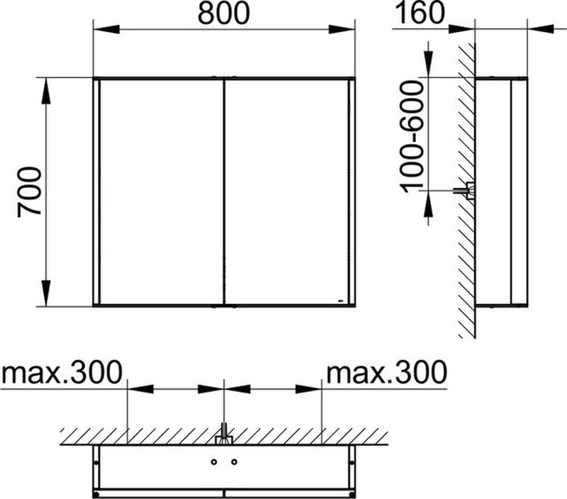 для монтажа на стене 2 поворотные зеркальные дверцы из двойного хрустального стекла, корпус из анодированного серебристого алюминия, задняя стенка из покрытого с тыльной стороны белым лаком стекла Управление: сенсорная передняя панель, можно включать и от общего выключателя в помещении Подсветка: Светодиоды 2 x 12,5 Вт (срок службы > 30.000 часов горения.), тон подсветки 3000 Кельвин (тёпло-белая) бесступенчатая реостатная регулировка, лампы не требуют замены