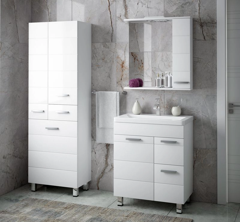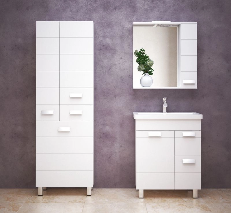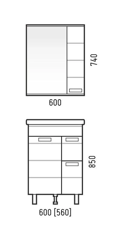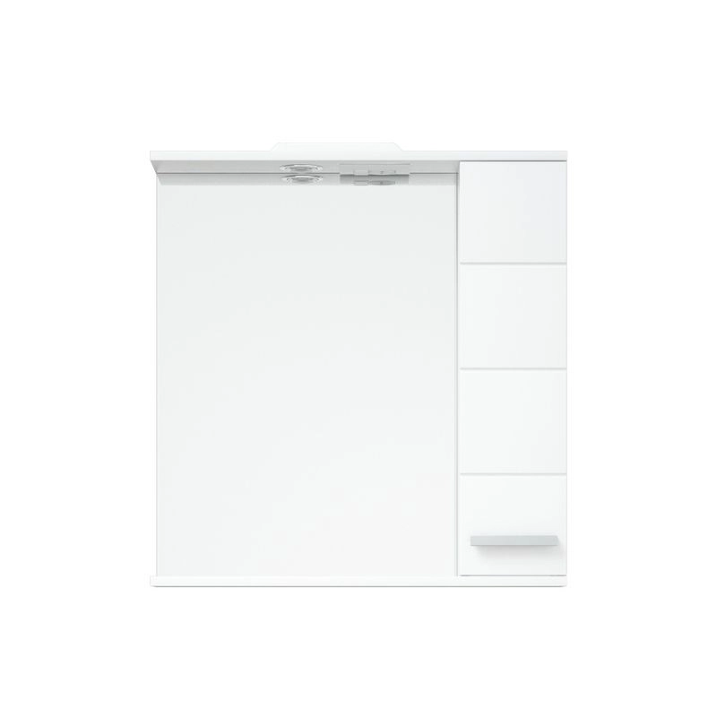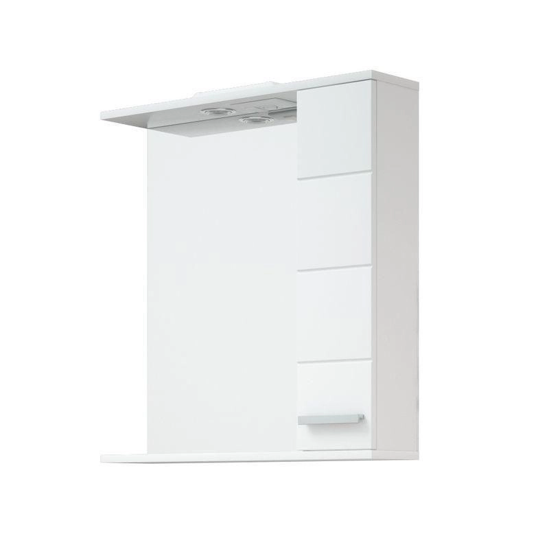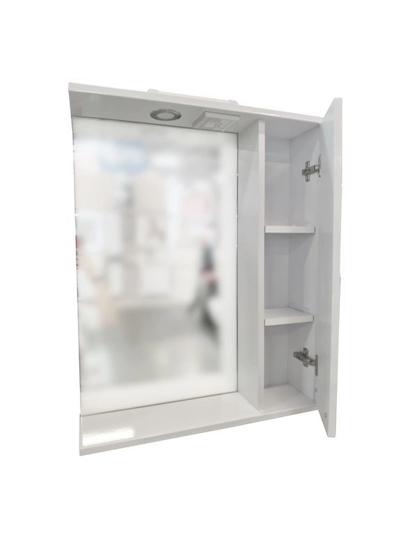Зеркало-шкаф оснащён распашной дверью справа, слева находится зеркало. За дверью расположены полочки. Петли с доводчиками. Зеркало-шкаф - с подсветкой, 1 светильник. Фасад, верхняя и нижние крышки - МДФ в плёнке.