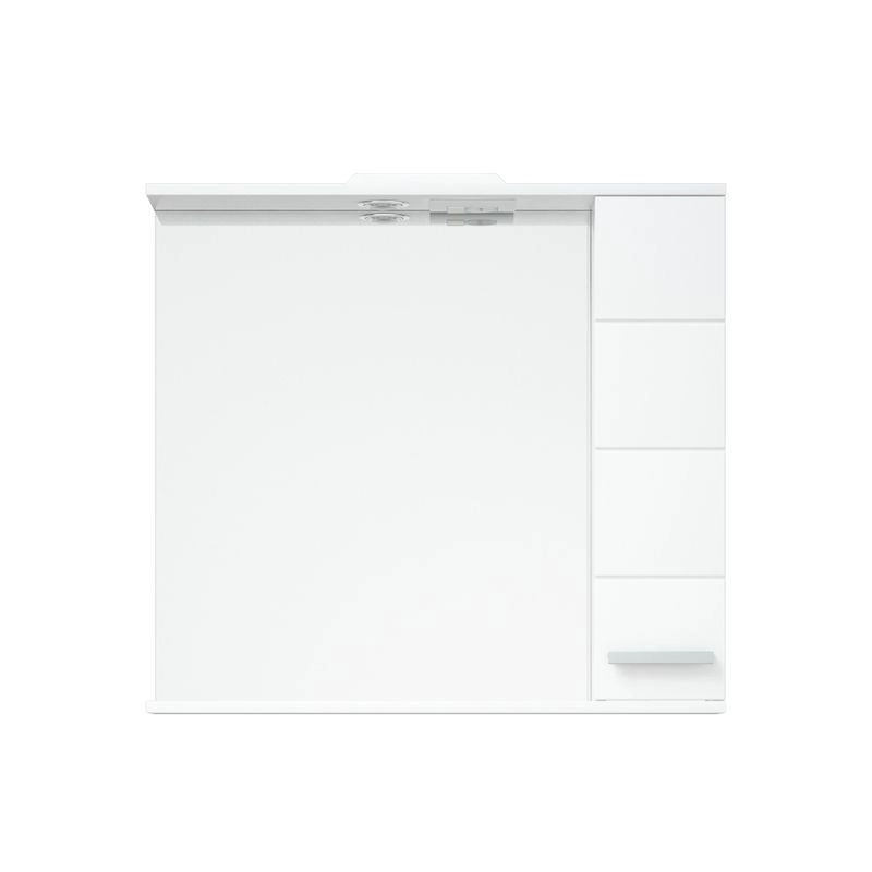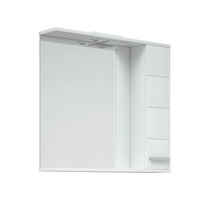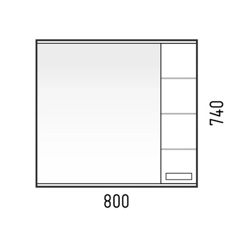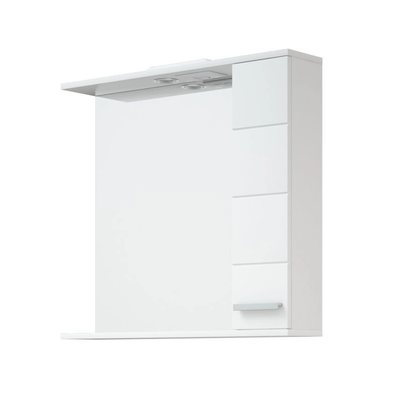 Зеркало-шкаф оснащён распашной дверью справа, слева находится зеркало. За дверью расположены полочки. Петли с доводчиками. Зеркало-шкаф - с подсветкой, 1 светильник. Фасад, верхняя и нижние крышки - МДФ в плёнке.