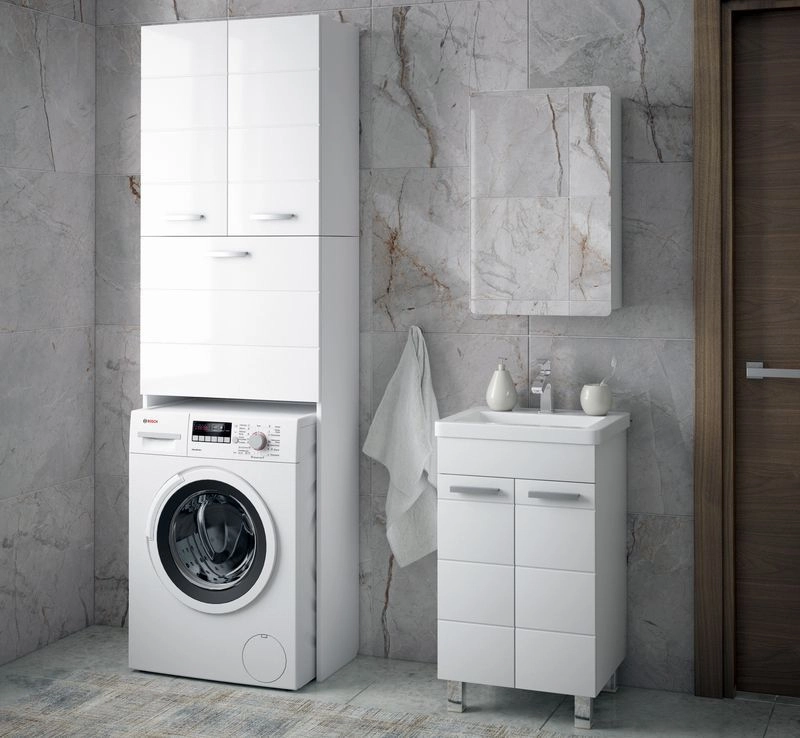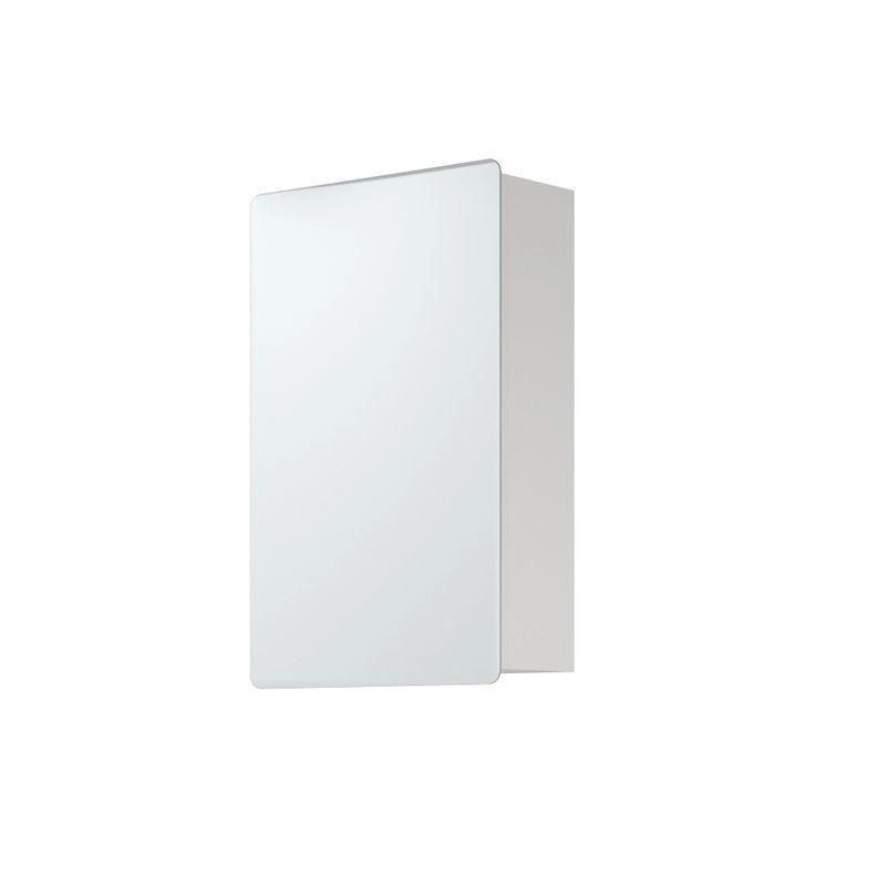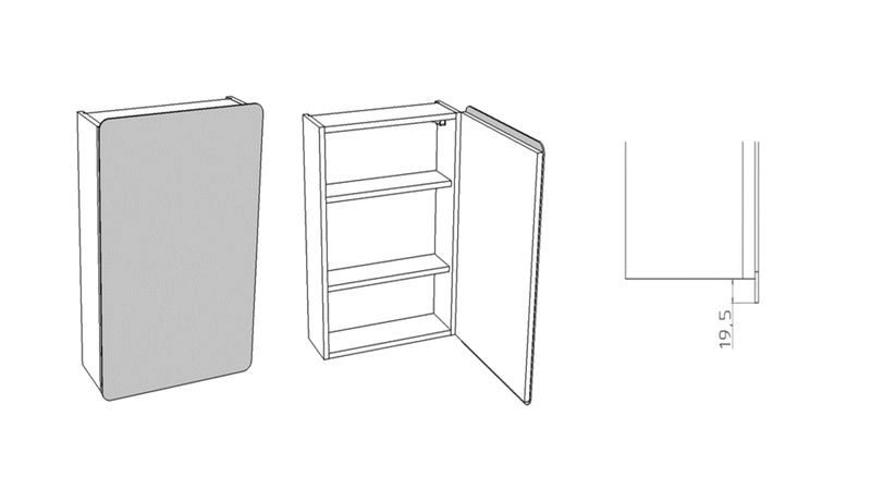 Зеркало-шкаф представляет собой шкаф с дверцей, на которую наклеено зеркало со скругленным полированными углами. Позади двери - 2 вкладные полки с возможностью регулировки по высоте. Петли на двери с доводчиками. Шкаф крепится к стене при помощи мебельных подвесов. Зеркало имеет отступ по краю снизу на 19,5 мм, за который дверь можно открыть.