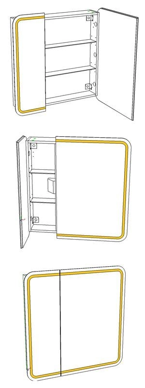 Зеркало имеет интересный эргономичный дизайн - скругления на углах и слегка выпуклая поверхность зеркального полотна делают этот вместительный зеркальный шкаф визуально более изящным. На каждой двери есть область, подсвеченная светодиодной лентой. За дверьми расположены по 2 стеклянные полки. Зеркальный шкф является универсальным - наличие внутри 4-х L-образных подвесов позволяет подвесить его, как будет удобнее - большой дверью направо или налево. За маленькой дверью расположена розетка.