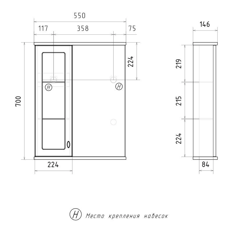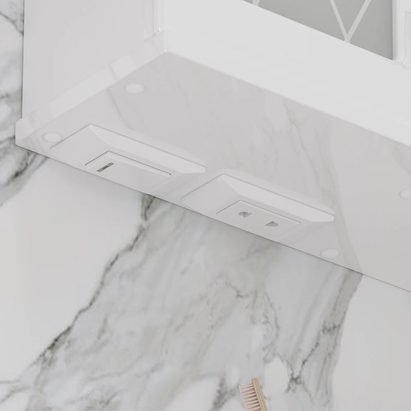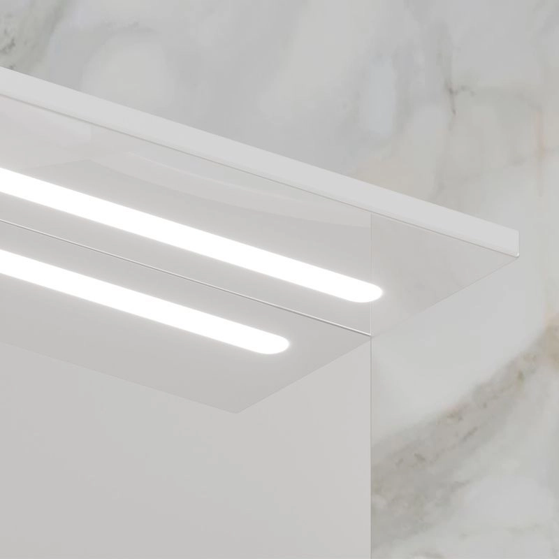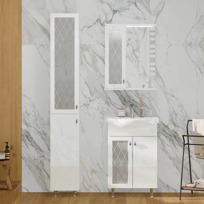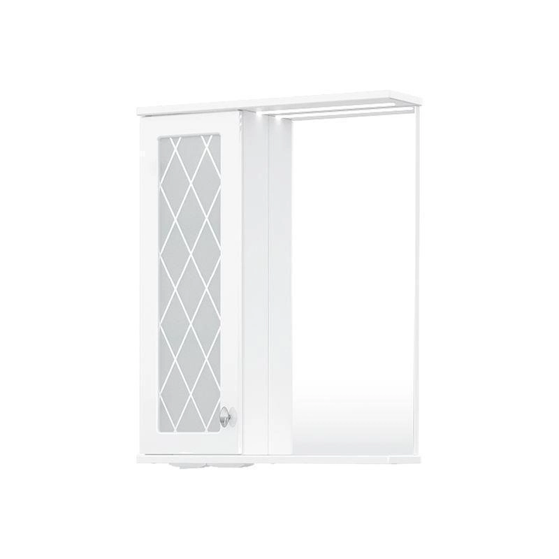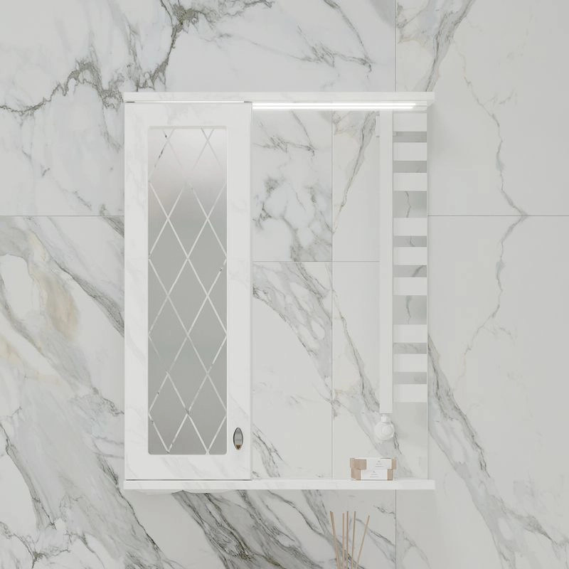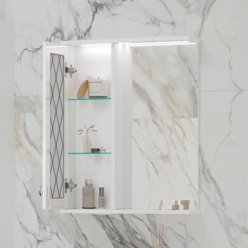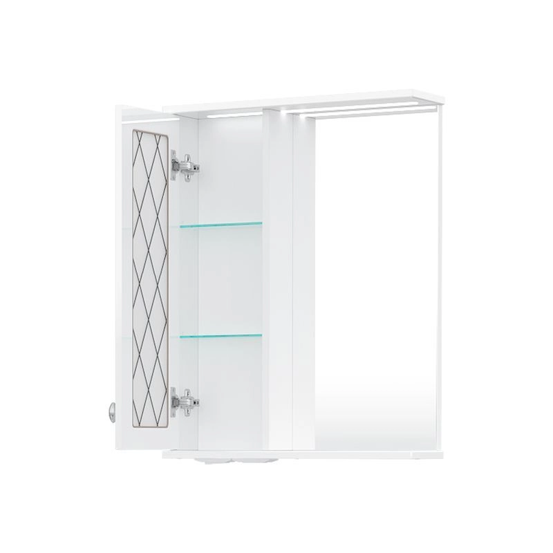 Зеркало-шкаф с двумя стеклянными полками за распашной дверцей. Петли оснащены доводчиками. Фасад зеркального шкафа изготовлена из МДФ и облицована глянцевой пленкой ПВХ. В дверце установлена вставка из зеркального полотна с рисунком амальгамой. Зеркало-шкаф оснащено встроенной светодиодной подсветкой, электрической розеткой и выключателем. Шкафчик открывается при помощи интегрированной ручки. Вставка из зеркального полотна с рисунком амальгамой, интегрированная ручка, фурнитура с доводчиками, встроенная светодиодная подсветка, розетка, выключатель.