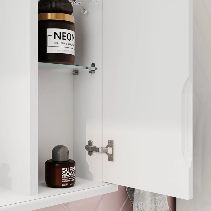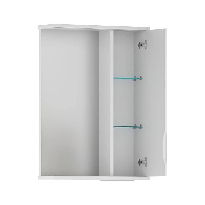 Зеркало-шкаф с двумя стеклянными полками за распашной дверцей. Петли оснащены доводчиками. Фасад зеркального шкафа изготовлена из МДФ и облицована глянцевой пленкой ПВХ. Шкафчик открывается при помощи интегрированной ручки. Декоративна фрезеровка на фасаде, интегрированная ручка, фурнитура с доводчиками.